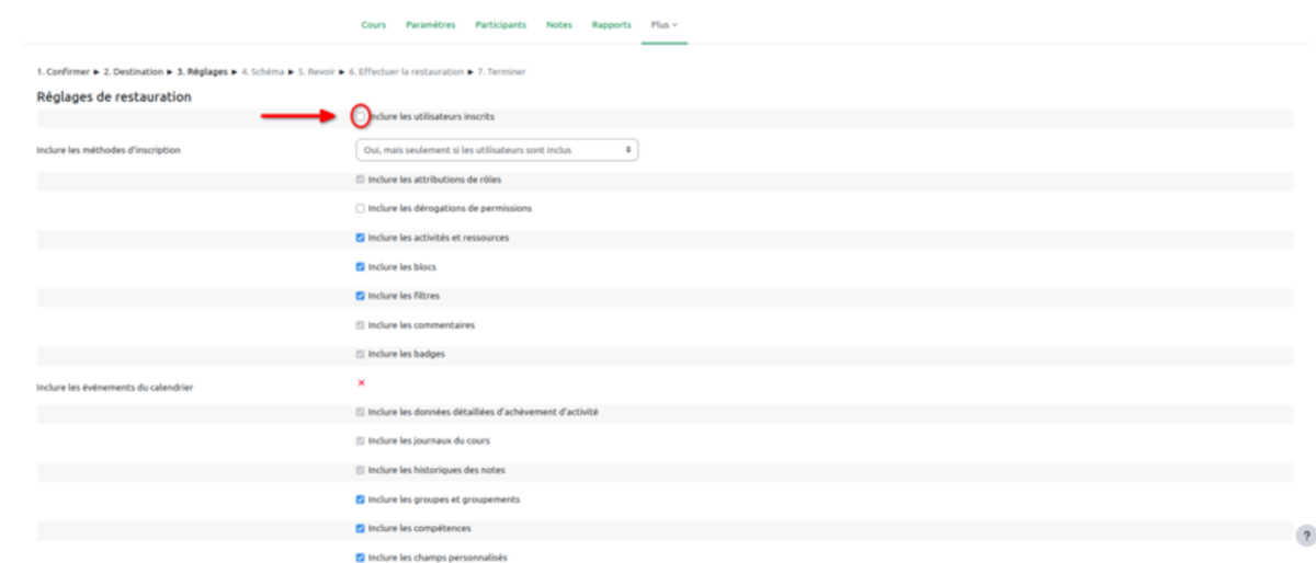 Etape 2 : destination ⇒ aller à la rubrique “restaurer dans ce cours” et cocher la case “Supprimer le contenu de ce cours, puis restaurer”