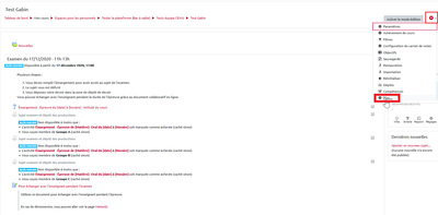 Pour accéder aux permissions du cours, vous cliquez sur la roue dentée en haut à droit de votre espace de cours et vous sélectionnez “Plus”